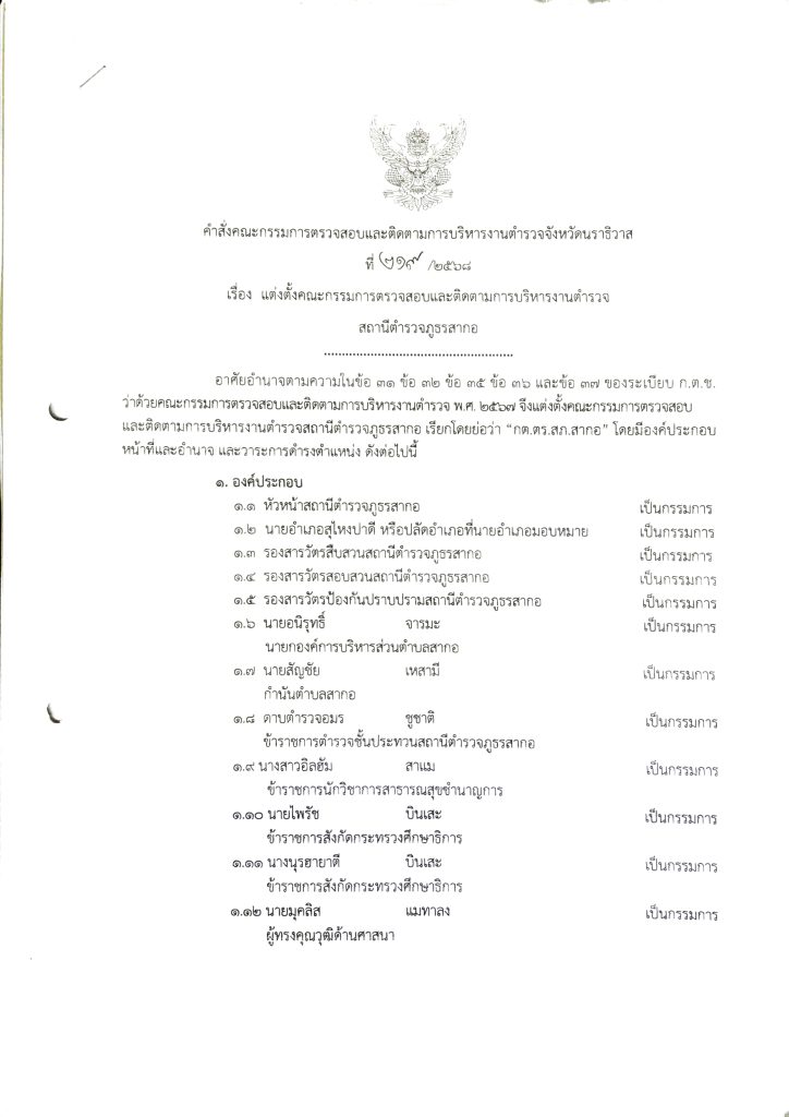 คำสั่ง แต่งตั้งคณะกรรมการตรวจสอบและติดตามการบริหารงานตำรวจ สถานีตำรวจภูธรสากอ